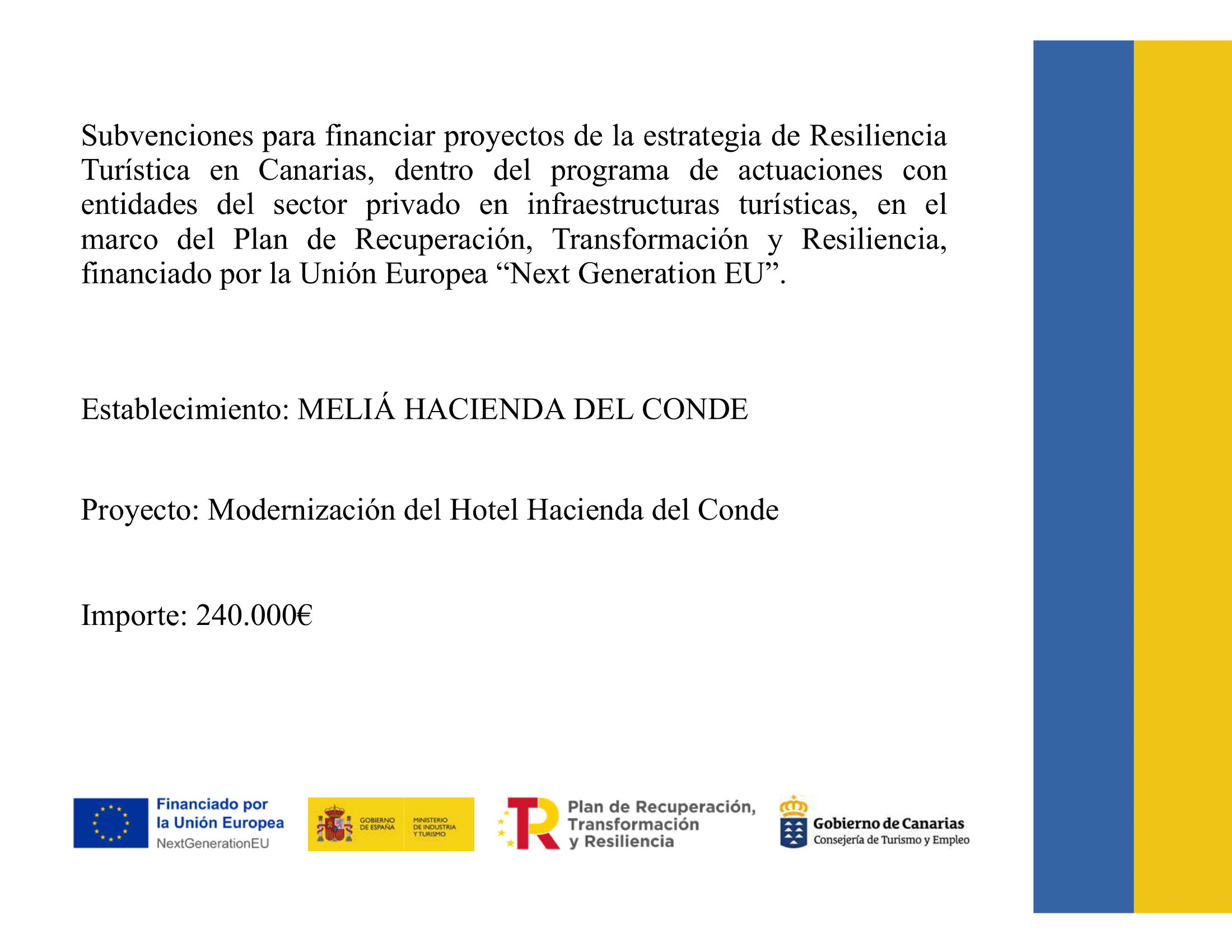 Entidad que desarrolla y realiza actividadades de explotación turística y deportivas, tales como la hotelera y gestión de campos de golf. Propietaria del Hotel Meliá Hacienda del Conde en Buenavista del Norte y la explotación del Campo de Golf “Buenavista Golf” Isla Baja en Tenerife.
